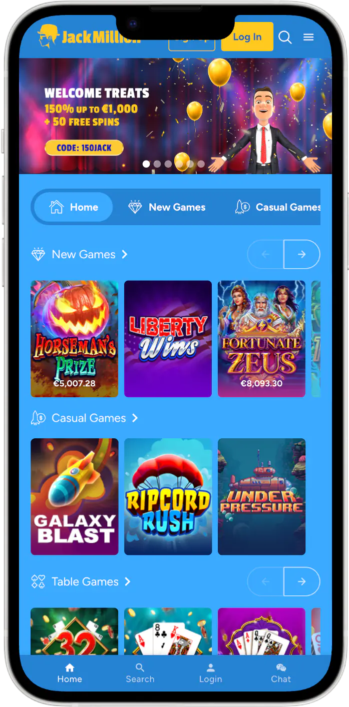 Una vez abres la web de JackMillion casino, notarás que la plataforma se adapta a tu pantalla móvil automáticamente. Así que solo tendrás que jugar usando tu teléfono o tableta desde cualquier lugar, sin límites.